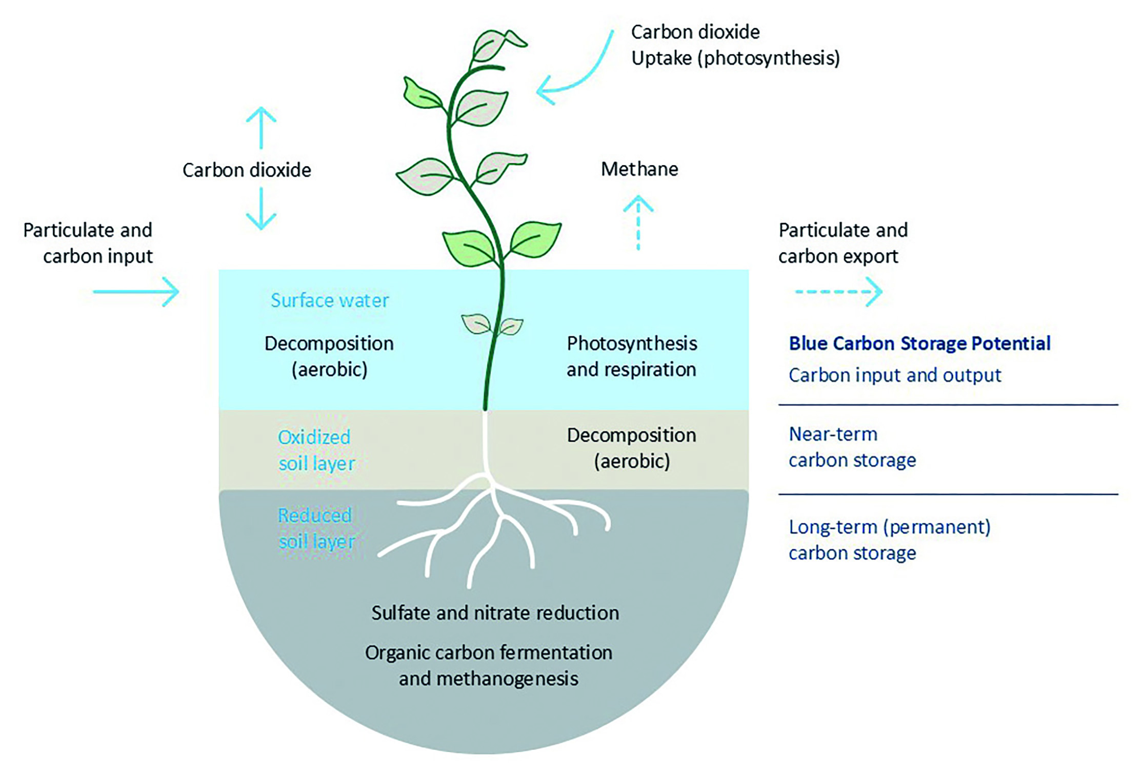 Sediment is a crucial part of aquatic ecosystems, forming the foundation for natural habitats and playing a vital role in sequestering and storing carbon. Blue carbon ecosystems absorb carbon through natural processes, such as sedimentation of organic- rich particles, photosynthesis, plant growth and decay, the partial decomposition of organic matter and the accumulation and burial of plant detritus (Figure 1). Short term carbon storage happens continuously at the sediment surface, while buried sediment and organic material contribute to long-term (permanent) carbon storage if left undisturbed. Estimates indicate that some mangrove forests and coastal wetlands are thousands of years old (Friess et al., 2019; Mangrove Action Project, 2016), representing long-term carbon storage and making them essential to the carbon mass balance in aquatic environments (Kristensen et al., 2025).