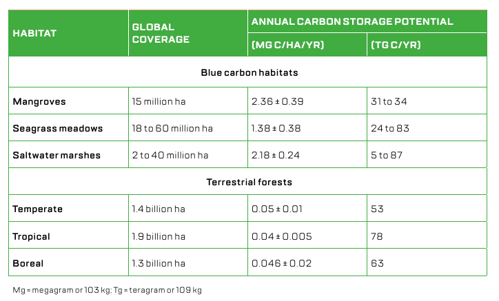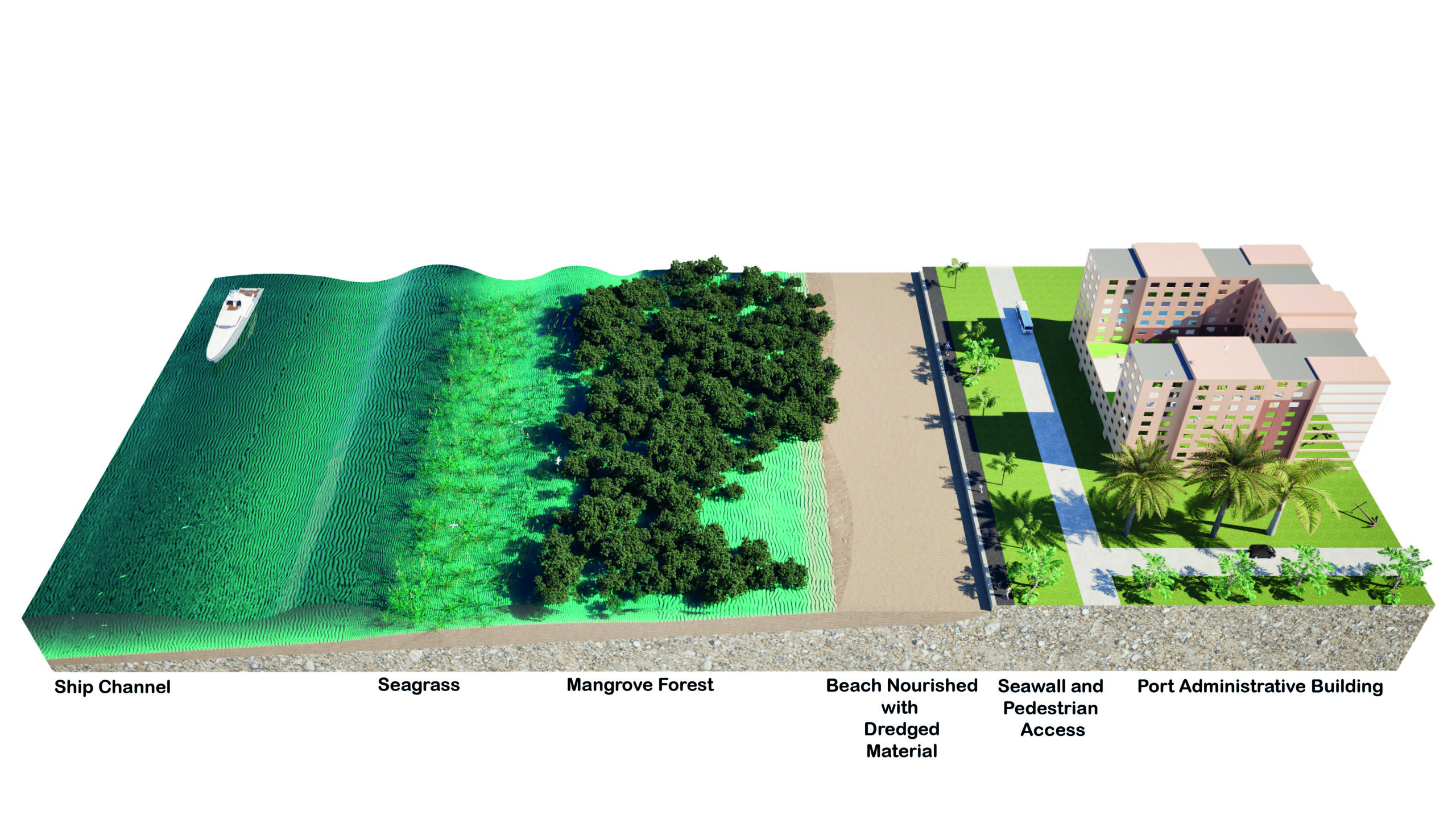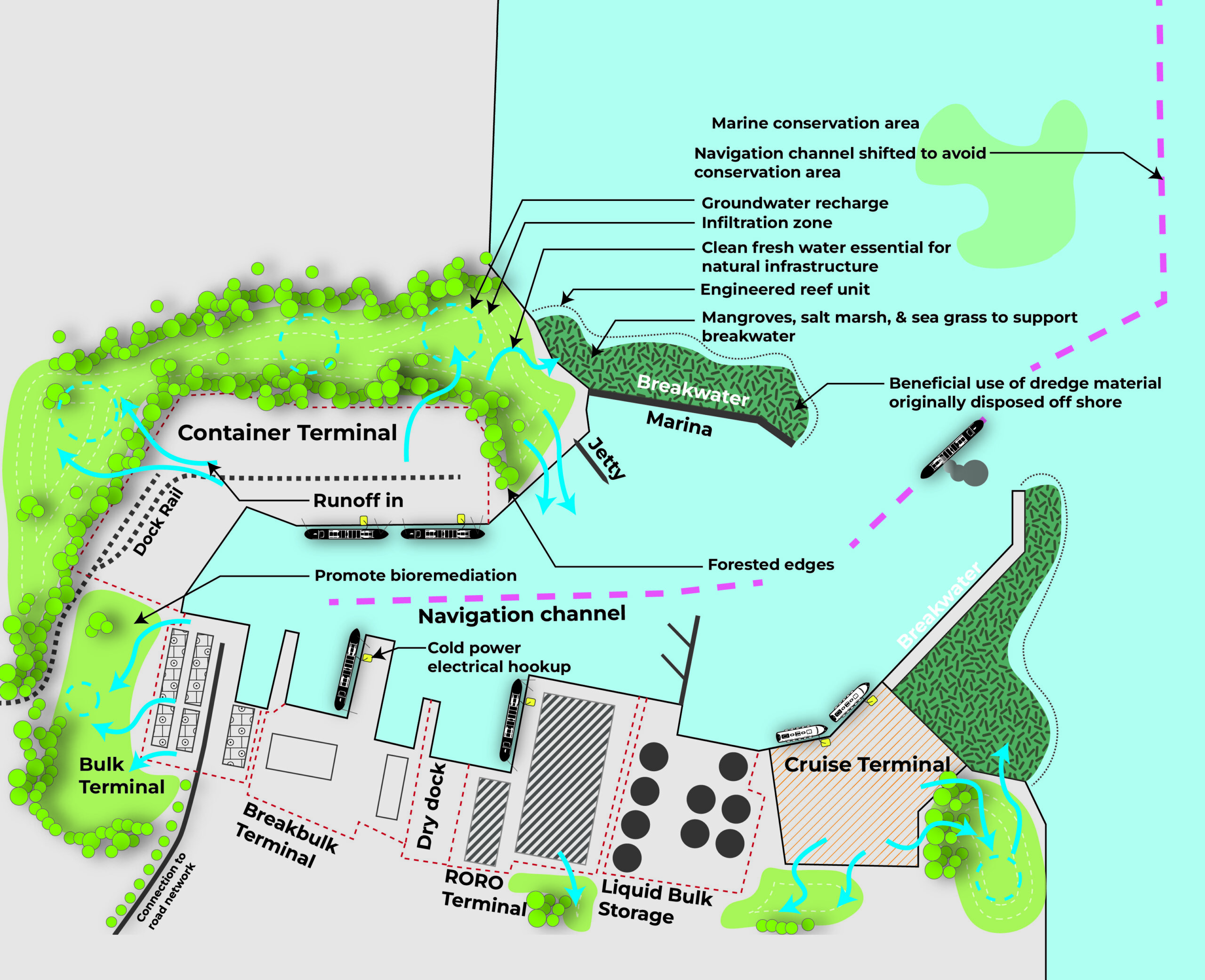 Ports and navigable waterways are pivotal to global trade but often are situated in and around marine coastal habitats, such as maritime forests, salt marshes and seagrasses – collectively known as blue carbon ecosystems. Blue carbon ecosystems (BCE) can sequester carbon at rates orders of magnitude greater than terrestrial ecosystems and are key components of the carbon mass balance in coastal environments, playing a vital role in long-term carbon management (McCleod et al., 2011). Protecting, restoring and managing BCE can help reduce the risks and impacts of a changing environment. These habitats also serve as natural infrastructure, reducing flood risk and associated vulnerabilities while providing multiple co-benefits through habitat enhancement including food provision, livelihoods and cultural services (Friess et al., 2024).