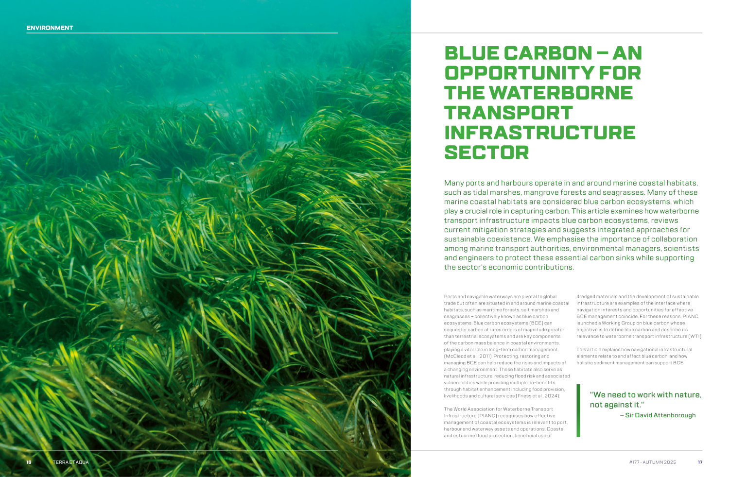 The World Association for Waterborne Transport Infrastructure (PIANC) recognises how effective management of coastal ecosystems is relevant to port, harbour and waterway assets and operations. Coastal and estuarine flood protection, beneficial use of dredged materials and the development of sustainable infrastructure are examples of the interface where navigation interests and opportunities for effective BCE management coincide. For these reasons, PIANC launched a Working Group on blue carbon whose objective is to define blue carbon and describe its relevance to waterborne transport infrastructure (W TI).