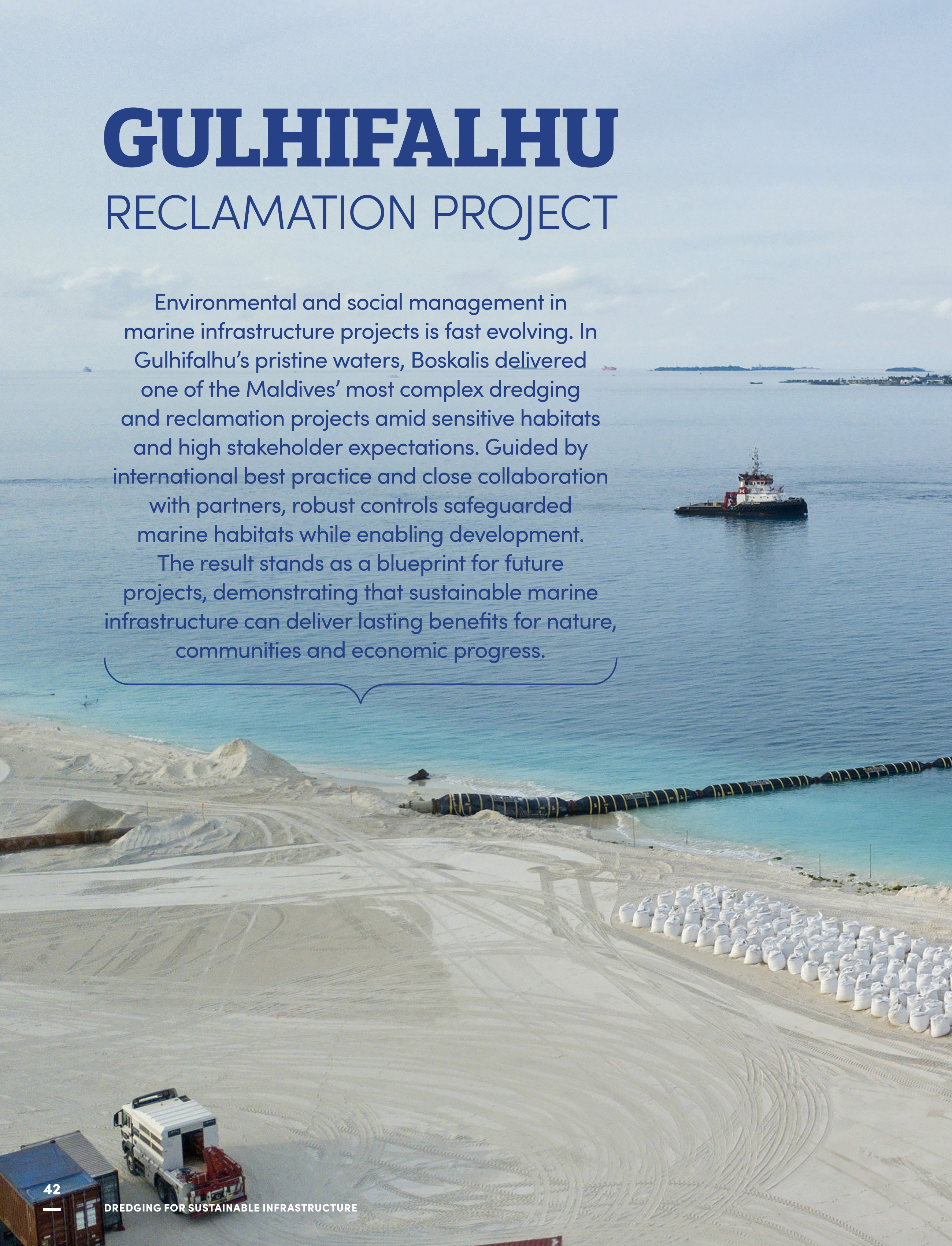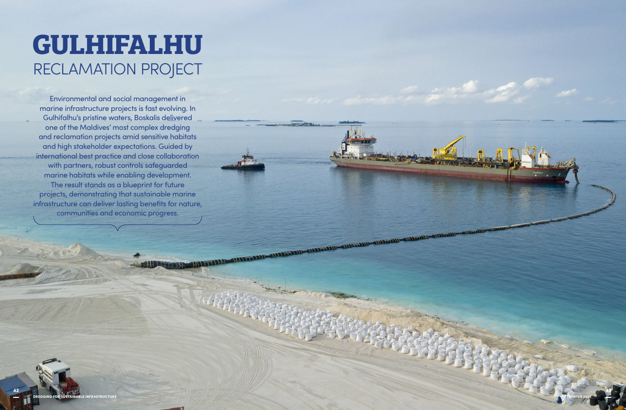 Boskalis’ work on the Gulhifalhu reclamation project offers a strong example of how this complexity was navigated. It is one of the first projects undertaken by the Government of the Maldives in compliance with international E&S standards, reflecting both the challenges and opportunities of aligning such requirements with large-scale marine infrastructure – and highlights the evolving role of a dredging contractor in shaping sustainable results. From the outset, the Ministry and Boskalis shared a clear objective: harmonise national processes with international E&S requirements, ensuring that financing, delivery and environmental stewardship worked in concert. Our experience illustrates how robust E&S frameworks can be seamlessly integrated into dredging operations – reinforcing responsible project delivery while safeguarding sensitive environments.