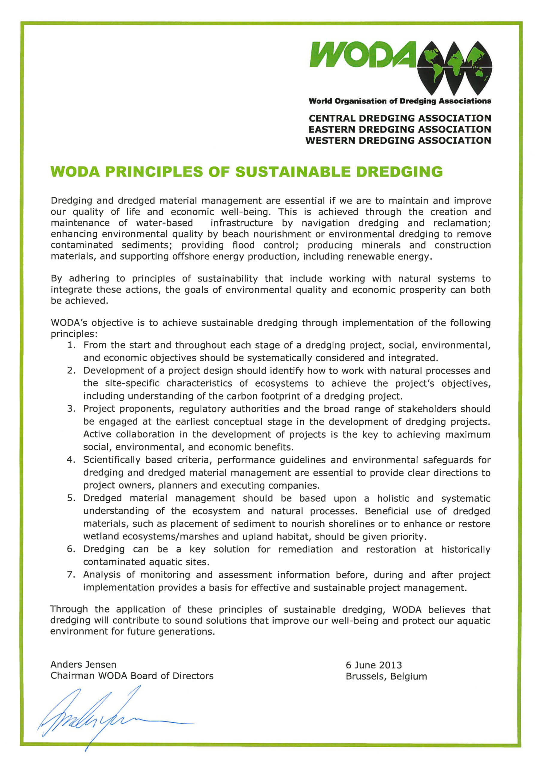 An example of organisational focus and application of sustainability in relation to dredging and infrastructure can be seen in the Environmental Operating Principles (EOP) of the United States Army Corps of Engineers (USACE). The USACE dredges approximately 250 million m3 of sediment annually (including permits for dredging issued through its regulatory programme). This level of dredging supports a network of nearly 40,000 km of navigation channel and the associated ports, in addition to flood risk management and ecosystem restoration projects. In 2002, the USACE developed and published its EOP, which were subsequently updated in 2012.