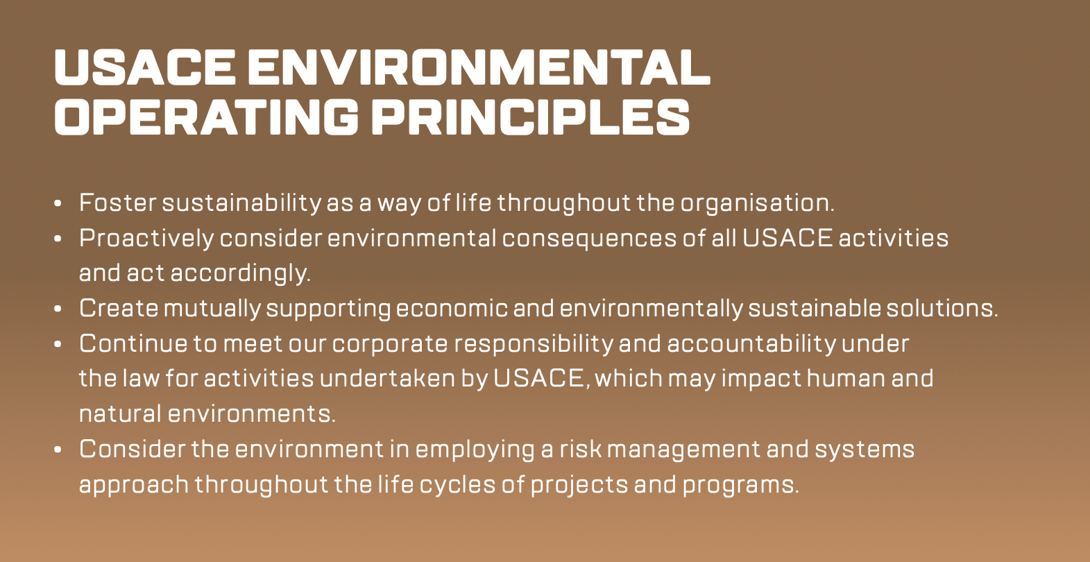 These principles were developed and disseminated by USACE as a means of advancing its stewardship of air, water and land resources while protecting and improving the environment. These principles have been communicated within USACE and codified as a part of an agency regulation so that each of the more than 30,000 employees of the agency “understand his or her responsibility to proactively implement the EOP as a key to the Corps mission.” (Bostick, 2012). The USACE EOP recognise the relationship of infrastructure development to the three pillars of sustainability, the importance of considering the long-term, life-cycle implications of agency actions, and the essential need to openly engage the stakeholders and interests affected by its projects and programmes.