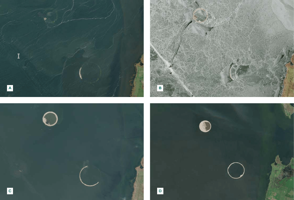 The construction sequencing of both islands, determined by the geotechnical stability and associated consolidation periods, is visualised with four satellite images shown in Figures 1A-D. Figure 1A, taken in October 2020, shows the submerged sand foundation layer at both islands. On the southern island, the western sector of the island was constructed above water first, since this part of the island required the longest consolidation period between the first and second above water reclamation step. At the northern island, the above water operations commenced.