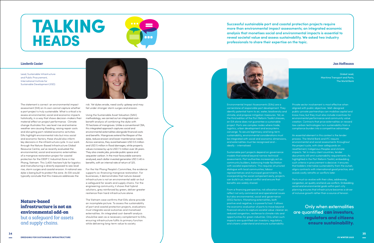 The statement is correct: an environmental impact assessment (EIA) on its own cannot capture whether a port project is truly sustainable. What is critical is to assess environmental, social and economic impacts holistically, in a way that shows decision-makers their material effect on project performance. Climate change illustrates this: sea level rise and extreme weather are causing flooding, raising repair costs and disrupting port-related economic activities. EIAs highlight environmental risks but miss social and economic factors; these should also inform key decisions in the infrastructure cycle. In our work through the Nature-Based Infrastructure Global Resource Centre, we’ve recently evaluated the environmental, social and economic externalities of a mangrove restoration project for coastal protection for the DEEP C Industrial Zone in Hai Phong, Vietnam. This 3,400-hectare hub for logistics and manufacturing is directly exposed to sea-level rise, storm surges and coastal erosion. A national sea dyke is being built to protect the zone. An EIA would typically conclude that this measure addresses the risk. Yet dykes erode, need costly upkeep and may fail under stronger storm surges and erosion.