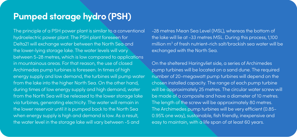 The Delta21 concept consists of two basins. The 50 km2 storage lake will be the lower basin. Its different water levels will be interconnected with pump turbines, allowing for the generation of gravitational energy due to the differences in height. The North Sea will form the upper basin of the PSH system. The installed capacity could be increased from 2 to 12 gigawatts, allowing the surplus of generated energy to be stored. PSH is proven to be a mature principle that is responsible for 93% of energy storage worldwide.