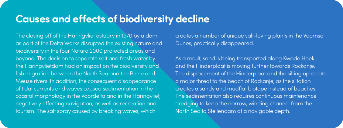 The mouth of the Haringvliet is under environmental pressure. Biodiversity in each of the four adjacent protected areas, Kwade Hoek, Duinen van Voorne, Voordelta and Haringvliet is slowly decreasing. Haringvliet used to be the main tidal estuary connecting the North Sea with the Rhine and Meuse, and was unique for its rich brackish water biotope. As part of the Delta Works, Haringvliet was cut off by a dam whose locks normally remained closed. Consequently, the Haringvliet estuary became a freshwater lake. Fish migration was strongly reduced and tidal currents weakened or even disappeared. This resulted in the sedimentation of the Haringvliet’s mouth and had consequences on the brackish ecosystem and recreation.