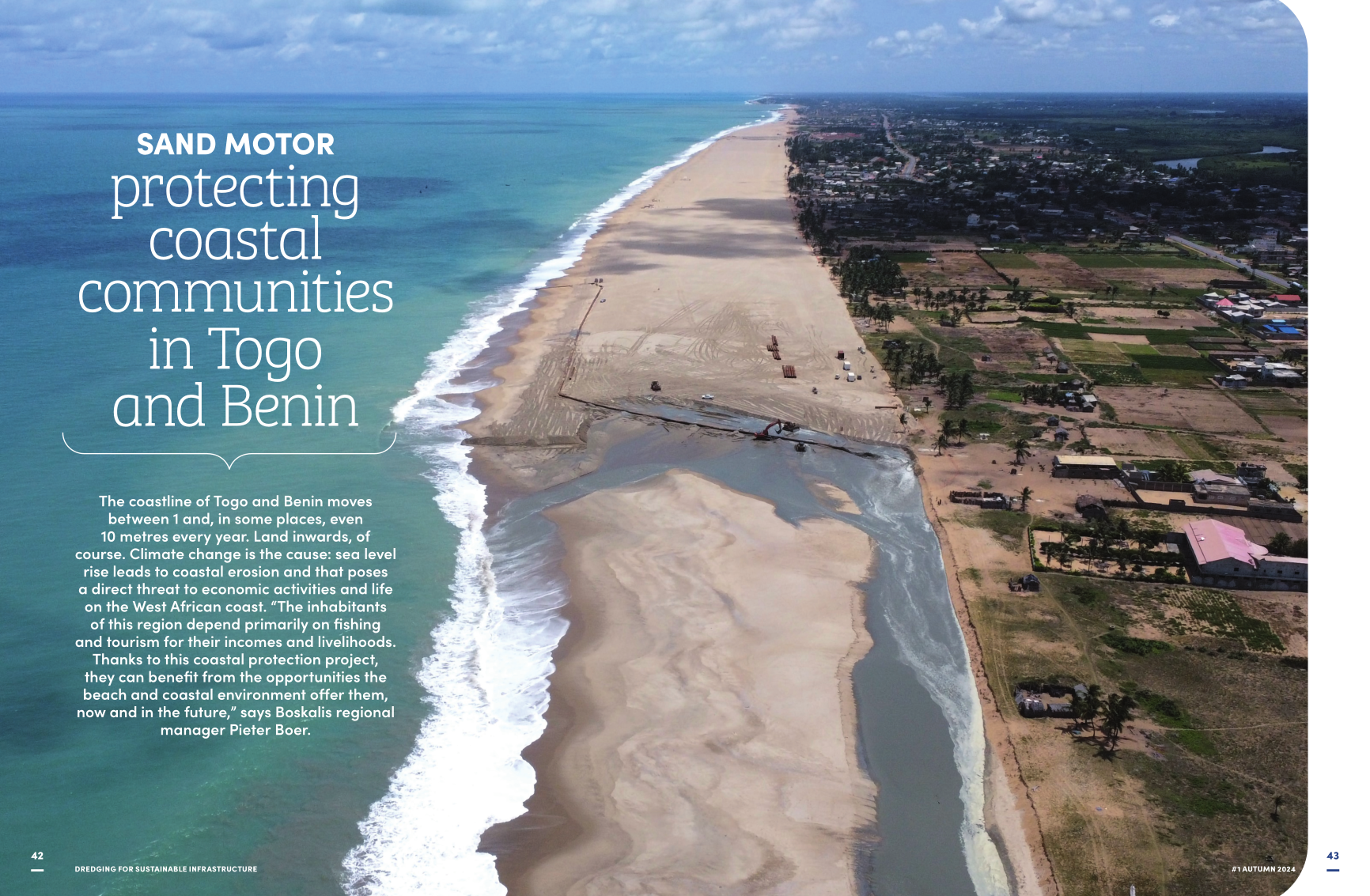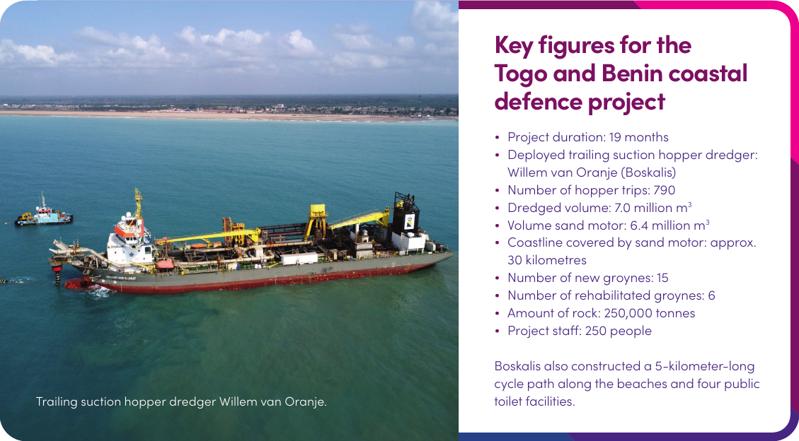 Boskalis was awarded the contract by the governments of Togo and Benin, with funding coming from the World Bank. Discussions with Boskalis convinced both West African countries of the potential of the proposed dredging solution. Because strengthening this section of the coast by implementing a dredging solution means that coastal residents can rest assured that their homes will be protected for the next 50 years. Since only part of the beach was closed off during the work at any given time, and completed sections were immediately returned to the community, the social impact of the far-reaching work on the coast was limited. And the regular base for fishing, and therefore economic activity, was kept intact throughout the operation.