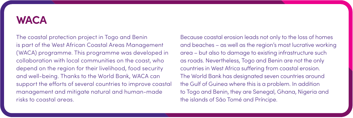 Just imagine, you open the door of your home and your entire living room is covered with a metre of sand. Before the summer of 2022, this was the harsh reality for hundreds of coastal residents in Togo and Benin. Calculations by the World Bank, among others, show that coastal erosion amounts to more than 2.5 metres a year in Togo and as much as 4 metres in Benin. Locally, even more serious cases of up to 10 metres a year have been observed. In addition, along the entire West African coast, the number of flash floods due to increasingly turbulent weather, which in turn is caused by climate change, is rising drastically, affecting half a million people annually.
