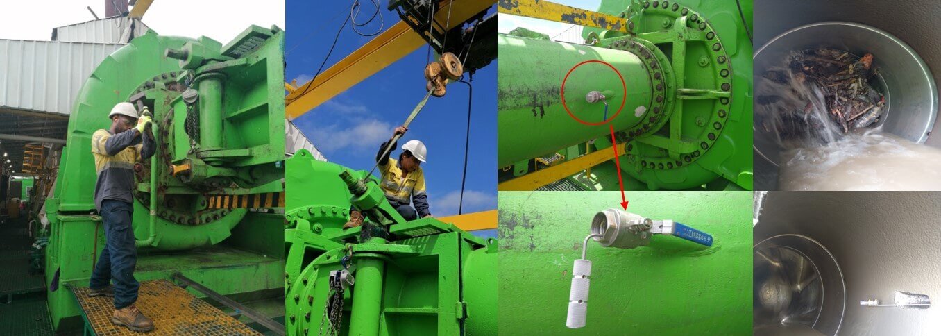 While performing dredging works on the parts of the Ok Tedi River in Papua New Guinea, DEME faced the following problem: the dredge pump and booster of its Cutter Suction Dredger (CSD) kept constantly getting clogged up with large amounts of timber, tree roots and other materials. As a consequence, the pump inspection hatch had to be opened and closed up to 22 times per day, as there was no other way to check if the pump was blocked. To avoid this inconvenience, DEME team have come up with a simple, but efficient solution: installation of a peephole that allows effortless inspection of the pump. With this design, the crew are able to carry out an inspection of the pump with the advantage of literally being able to see "through" the pump.