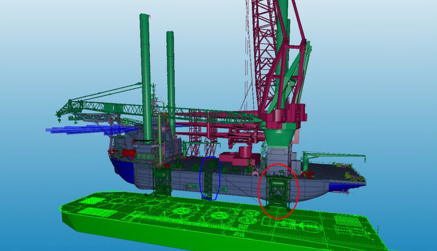 Van Oord opted for a method in which the feeder barge with the components moors against a jacked up WTIV. To do so, the system requires  compensation for tidal, waves and barge loading conditions in order to make sure the barge remains securely moored against the Aeolus during the complete unloading of the barge in offshore conditions.