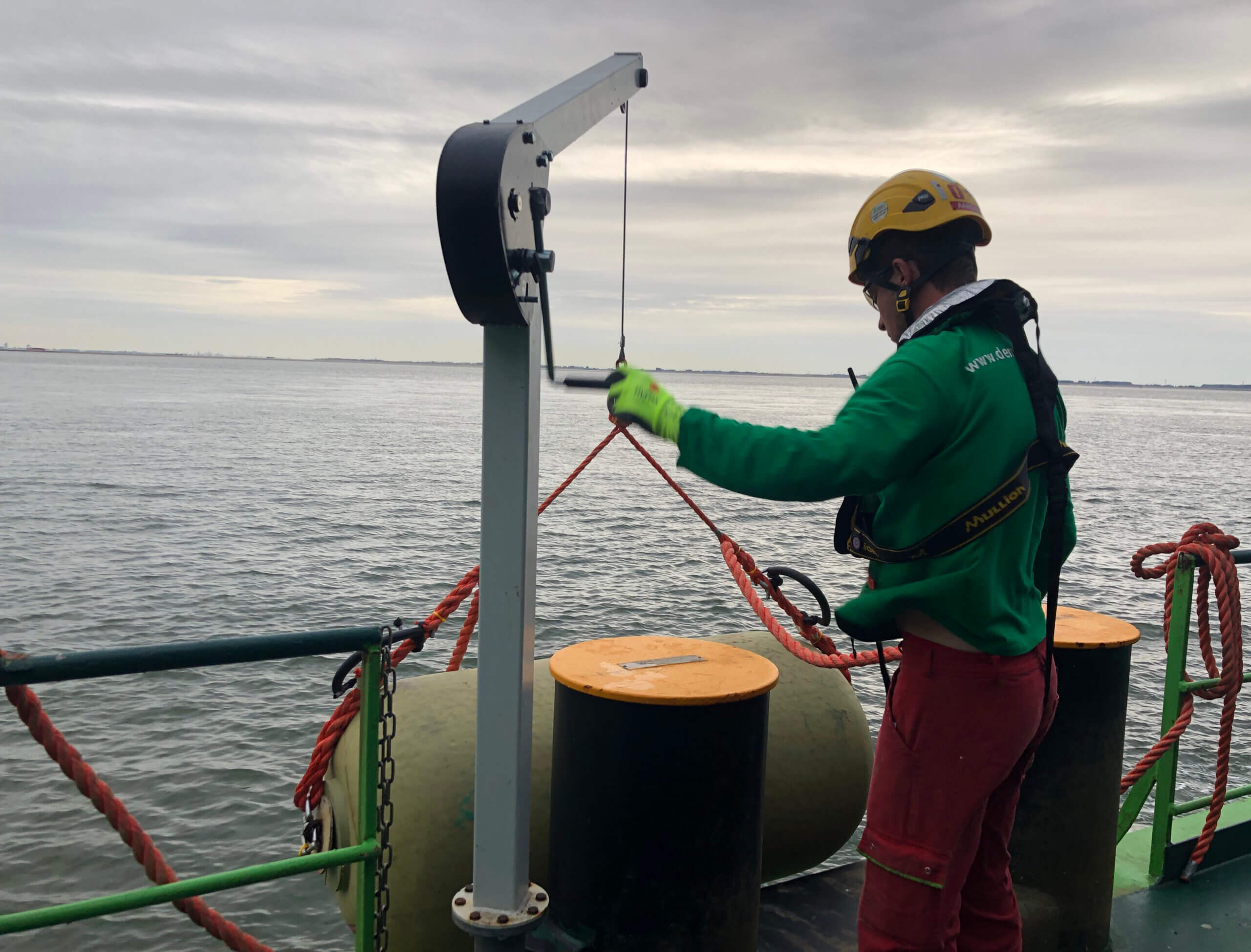 DEME has decided to eliminate potential risks by designing a mobile davit, which can be positioned in five different locations around the hopper. This lightweight davit of just 30 kilograms has a working load limit of 125 kg and an integrated winch. This simple appliance brings considerable benefit of performing the job efficiently, but without running risks of physical strain.