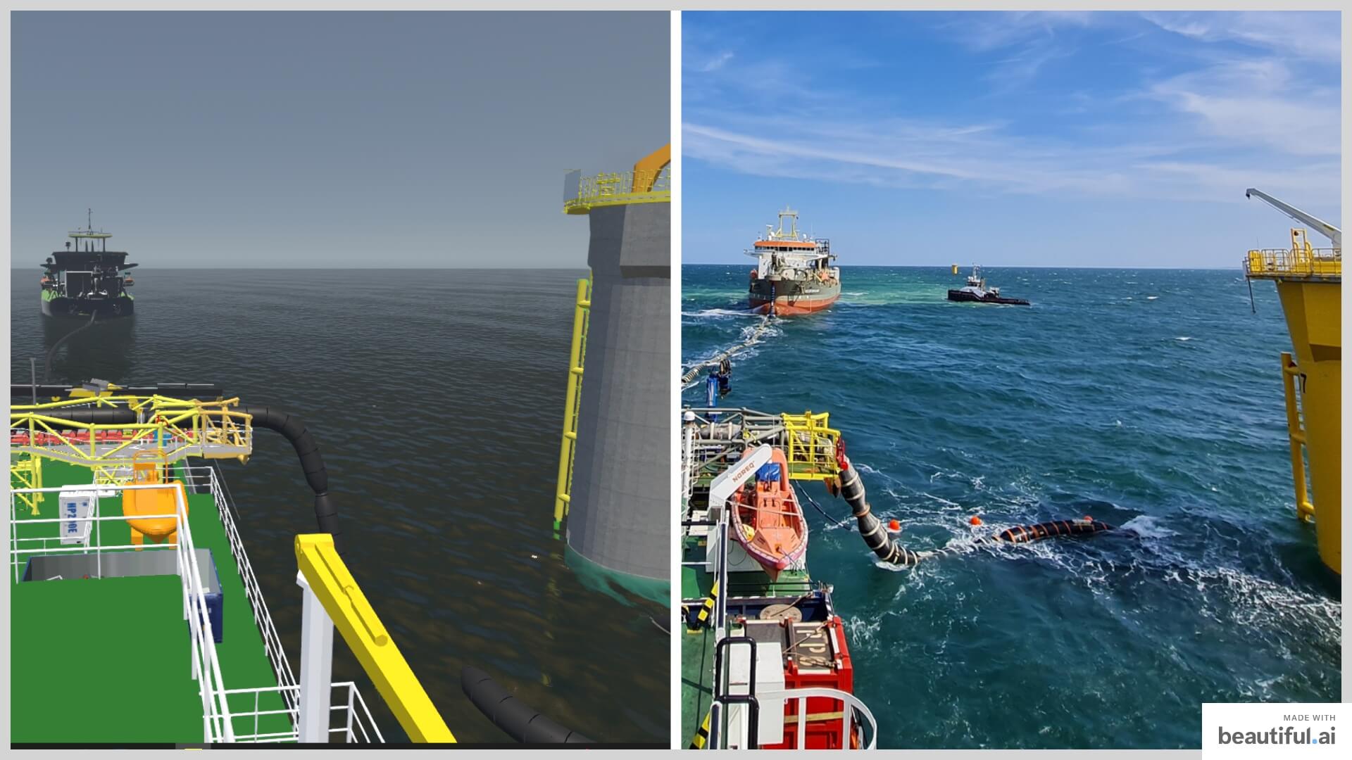 With a complex project involving a short offshore installation period and numerous modifications taking place on different vessels, Boskalis’ project team turned to VR technology. Early on in the project they decided to have operational models created in virtual reality (VR) of the new equipment and various locations involved. This way, safety critical operations were tested and discussed upfront during design reviews, HAZIDs and familiarisations, without the need to expose personnel to risks, such as working at height or possible delays to the project incurred during acceptance tests. The models were able to apply different weather states including daylight or actual current predictions and allowed movement as a pedestrian or operator across the models.